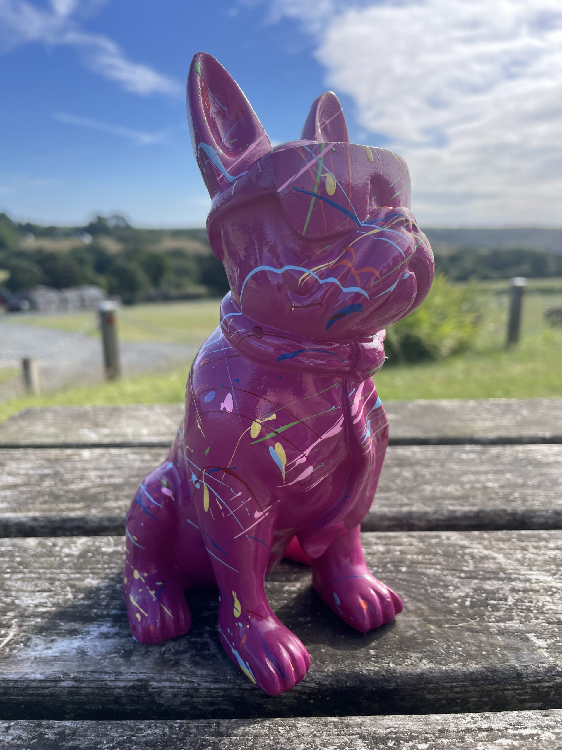 Small Sitting French Bulldog Wearing Glasses in Splash Paint Purple